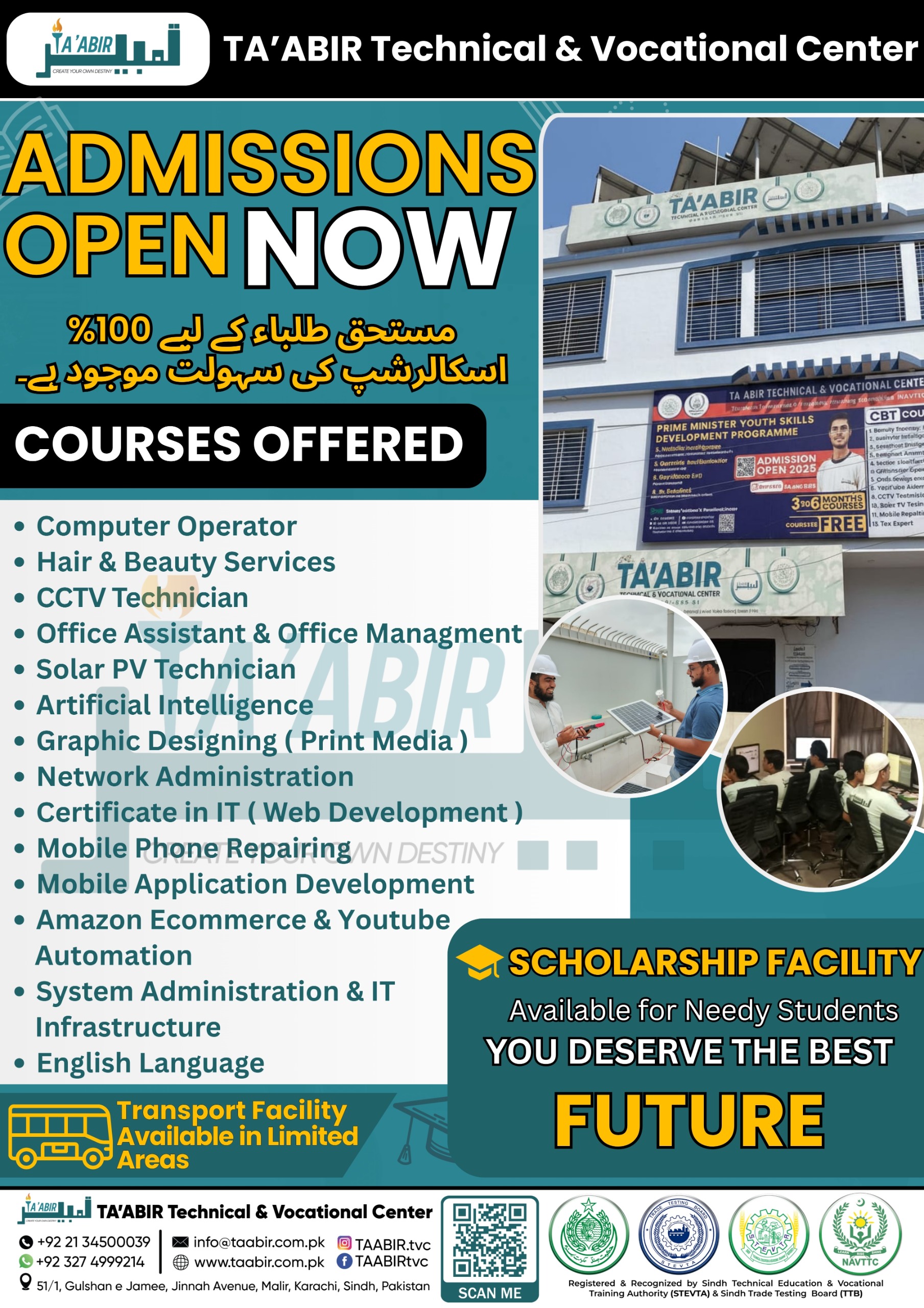 For more information, contact us at: Phone: 021-34500039 WhatsApp: 0327-4999214 Email: info@taabir.com.pk Address: 51-1, Gulshan e Jamee, Jinnah Avenue, Opposite Check post No. 2, Malir, Karachi Hurry! Limited seats available. Start your journey towards a bright future with TAABIR Technical and Vocational Center